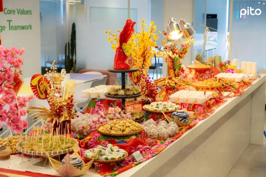 Trang trí theo concept YEP, tone màu thương hiệu hoặc không khí cuối năm. Biến không gian quen thuộc thành bữa tiệc tất niên “nhìn là thấy Tết”.